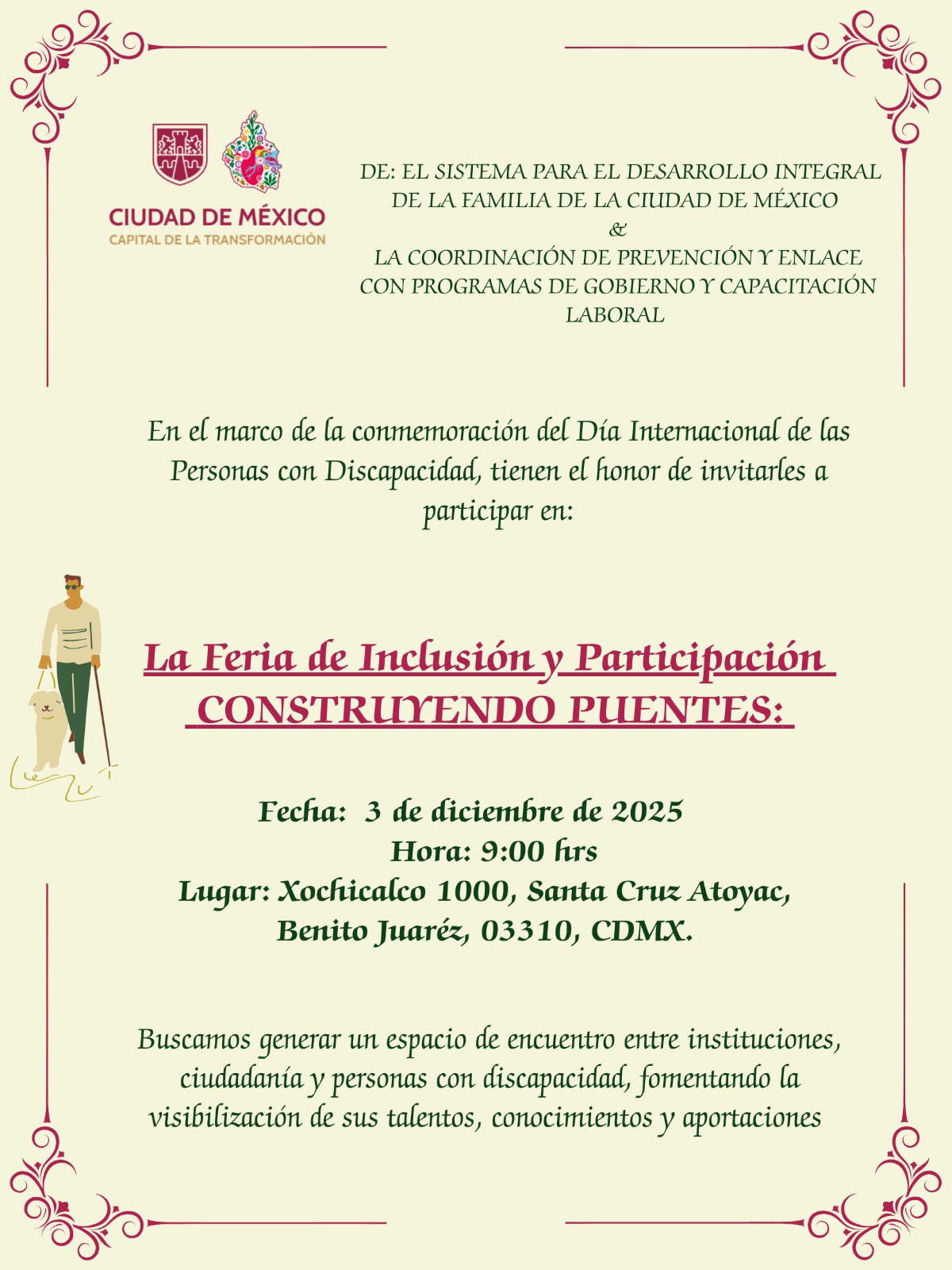 En el marco del Día Internacional de las Personas con Discapacidad, el Sistema para el Desarrollo Integral de la Familia de la Ciudad de México y la Coordinación de Prevención y Enlace con Programas de Gobierno y Capacitación Laboral tienen el honor de invitarte a: