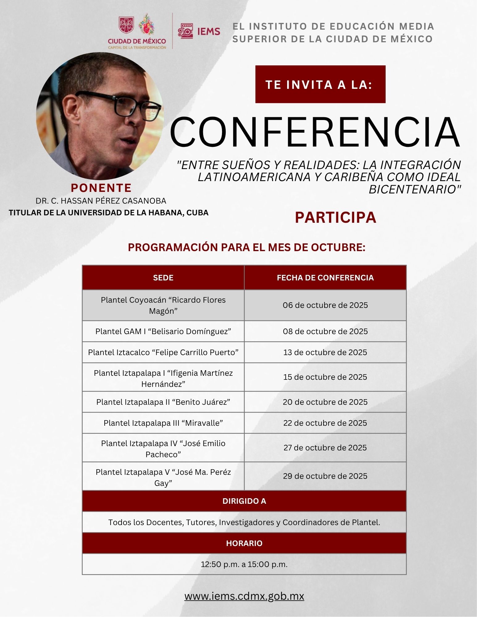 El Instituto de Educación Media Superior tiene el honor de invitar a su personal docente, tutores, investigadores y coordinadores de plantel a una enriquecedora conferencia sobre integración regional.