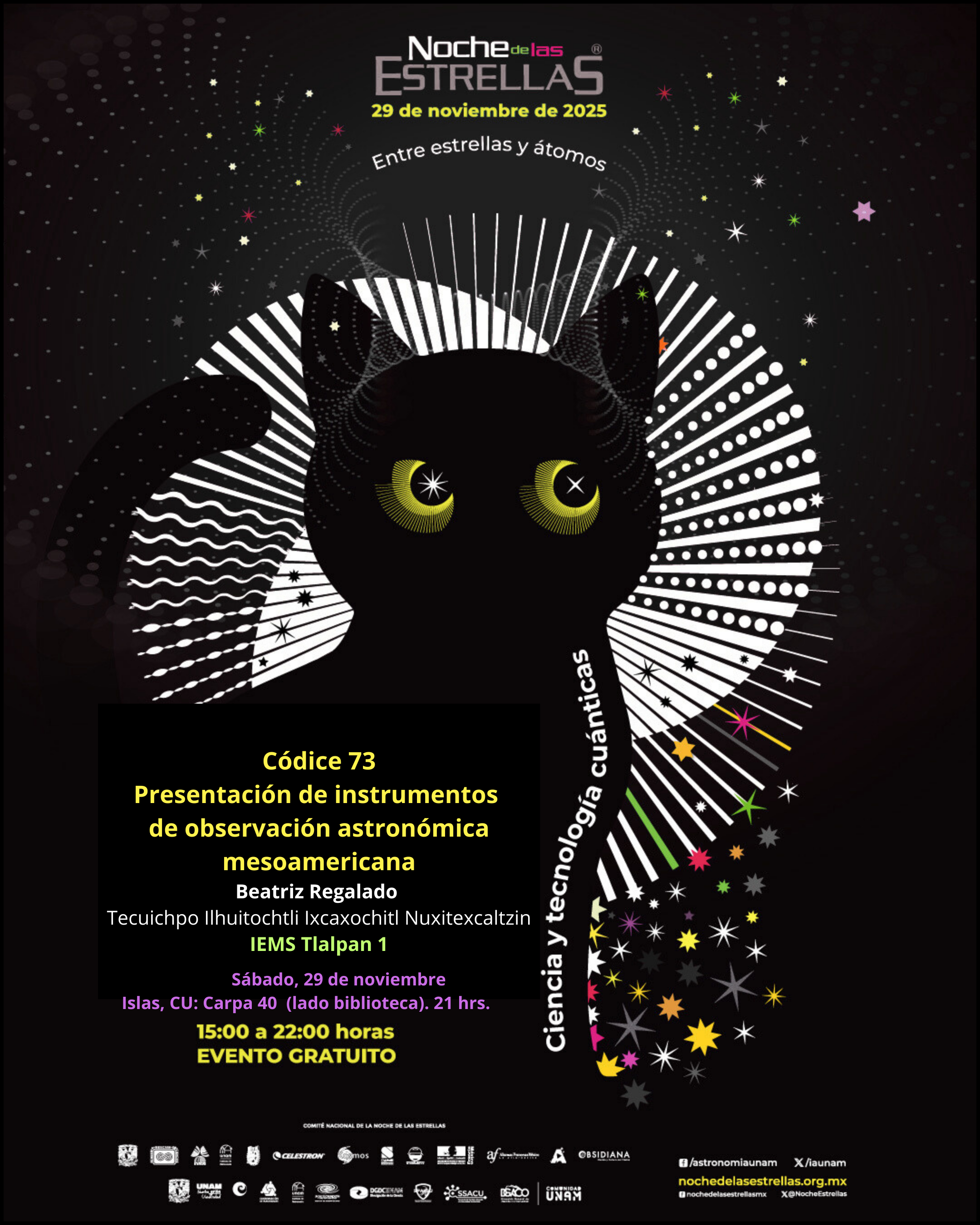 El IEMS participará con la Carpa No. 40 “Tlachia”, un espacio de ciencia, cultura y astronomía mesoamericana donde docentes, estudiantes, colaboradores y egresados del Instituto compartirán actividades, talleres, charlas y observaciones del cielo.