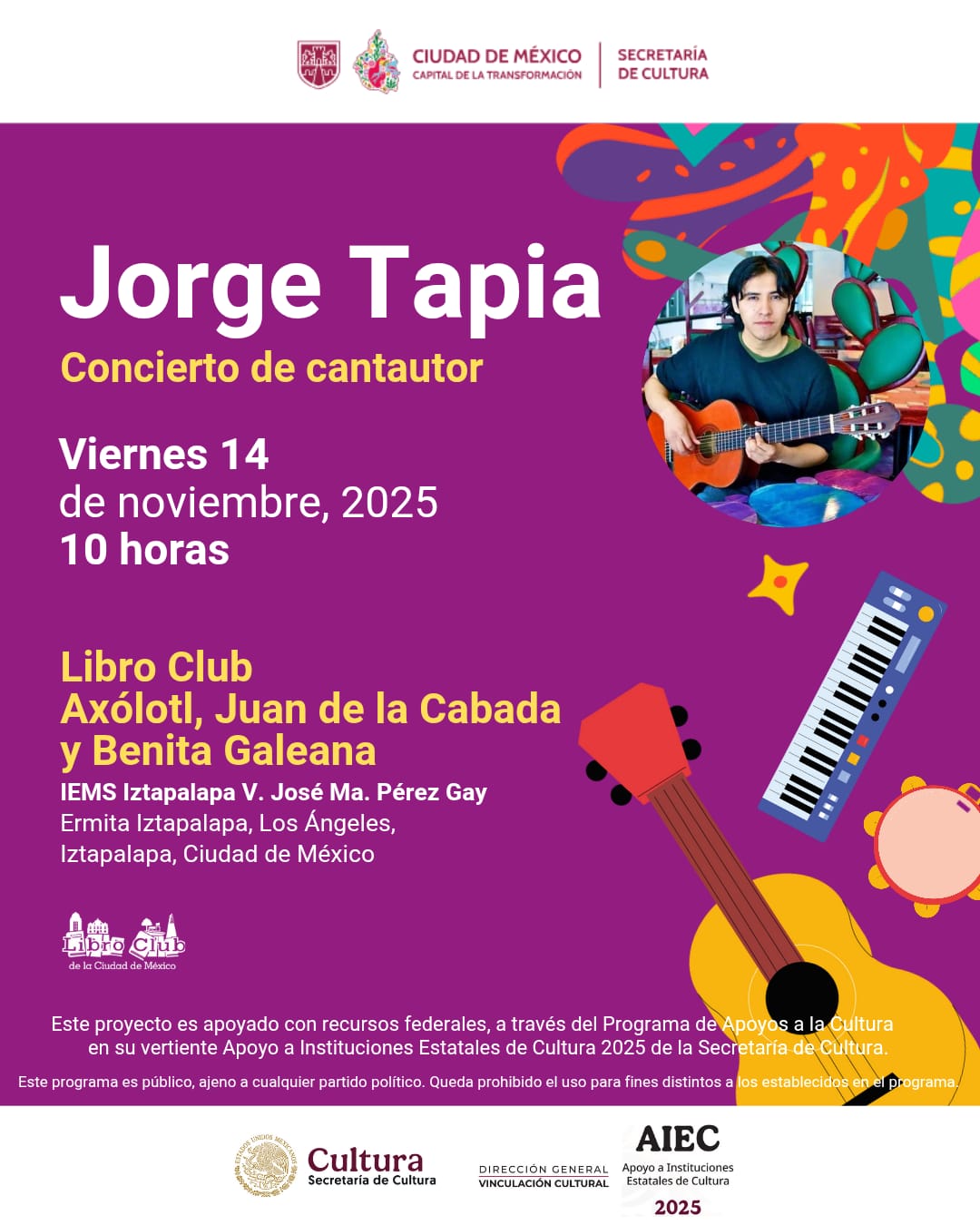 ⭐ Destacados del Evento: Talento IEMS: Disfruta del Concierto de cantautor con Jorge Tapia, presentado en el Libro Club Axólotl, Juan de la Cabada y Benita Galeana.