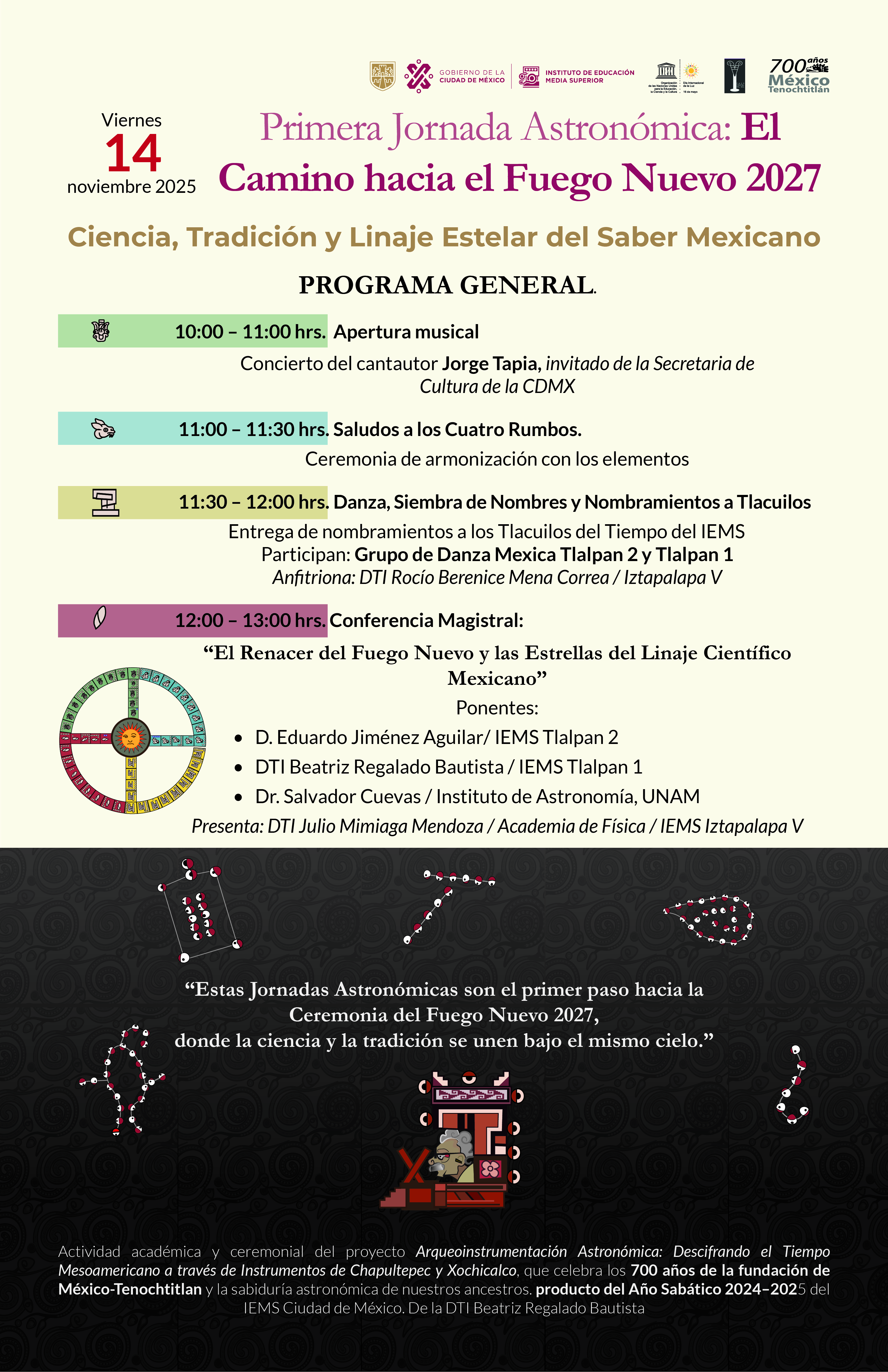 El Instituto de Educación Media Superior (IEMS) te invita a participar en la “Primera Jornada Astronómica: El Camino hacia el Fuego Nuevo 2027”, un evento que fusiona la ciencia, la tradición y el linaje estelar del saber mexicano.